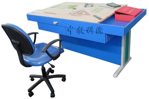 (一)钢木绘图台桌:桌结构采用优质三聚氰胺板、钢脚结构,规格:长1100mm,宽640mm,高760mm(附图),桌面附金属可倾斜升降的架子,前方可倾斜升降0-45度调节,桌面右侧(活动抽屉,不用时可以节省空间)可放置仪器、工具,附有抽屉供放学习资料、工具书等。画板材质为:高级椴木。